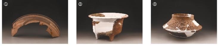 图①②③分别为蒋家遗址出土的鱼纹彩陶盆、陶灶、陶釜(资料照片)。陕西省考古研究院供图