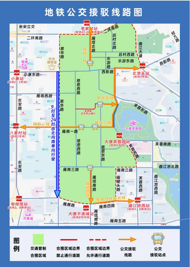 (五)结合交通流量变化,在友谊路、长安路、朱雀大街、聚文路、雁南五路、南三环、曲江大道、西影路、经九路等道路沿线,采取疏导管控、点滴放行等措施,对前往曲江方向车辆进行疏导分流。