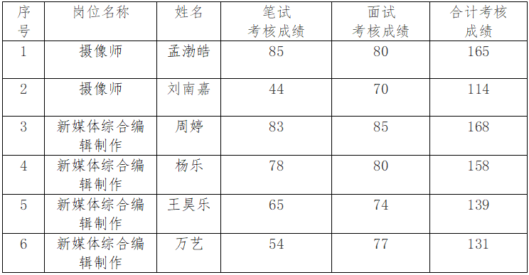 根据西安广电快客影视传媒有限公司此次招聘的总体安排和工作要求,并经报名、资格审查、笔试、面试等程序,现将此次招聘笔试面试考核成绩予以公示。