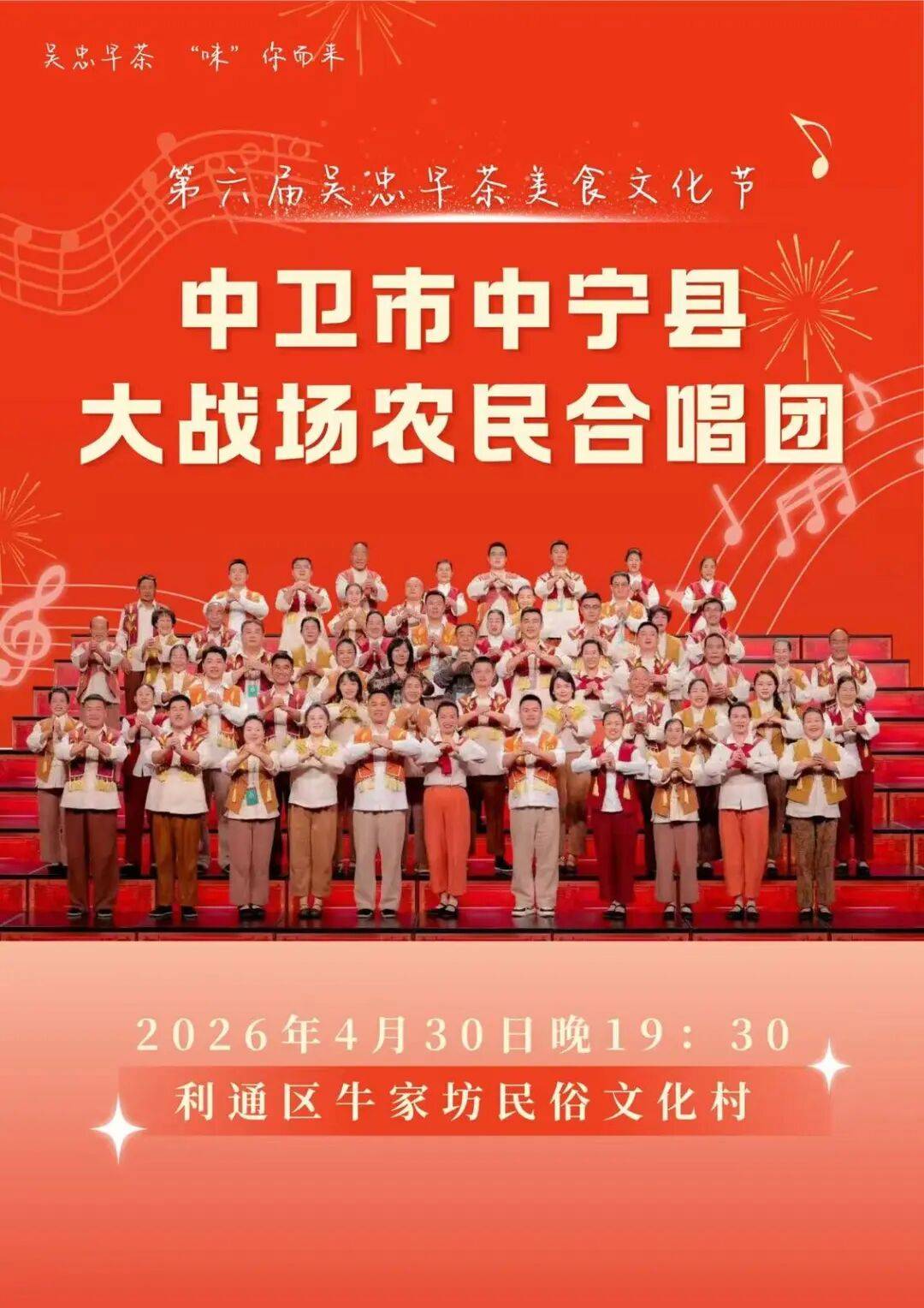 顶级声浪来袭!作为活动主会场,利通区牛家坊民俗文化旅游区将化身“不夜城”,16项专场演出轮番轰炸视觉与听觉。4月30日晚上,曾登上央视春晚舞台的中卫大战场农民合唱团将深情献唱,用来自田野的质朴歌声致敬时代;5月1日晚上,四川音乐学院青年合唱团接力登场,将带来《我的祖国》《世界赠予我的》等17首经典曲目,打造学府殿堂级视听盛宴。